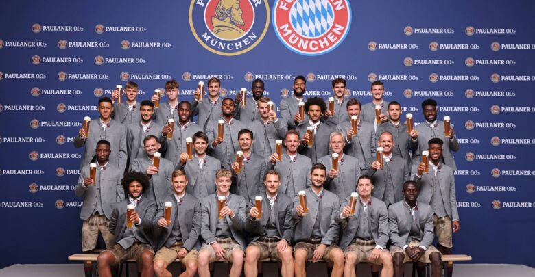 والتقط لاعبو نادي بايرن ميونيخ الصورة الجماعية الموسمية لشركة الخمور أحد رعاة للنادي والمنوط بها تقديم المشروبات الكحولية خلال احتفالات شهر أكتوبر في ميونخ.