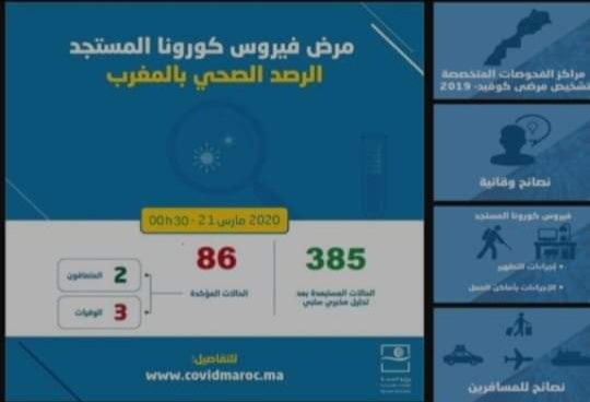 7 حالات جديدة منها 2 من تطوان، و 2 من الدار البيضاء، وواحدة من الرباط، وواحدة من سيدي سليمان، وواحدة من وجدة وبذلك يكون عدد الحالات المؤكدة بالإصابة بفيروس كورونا المستجد 86 حالة.