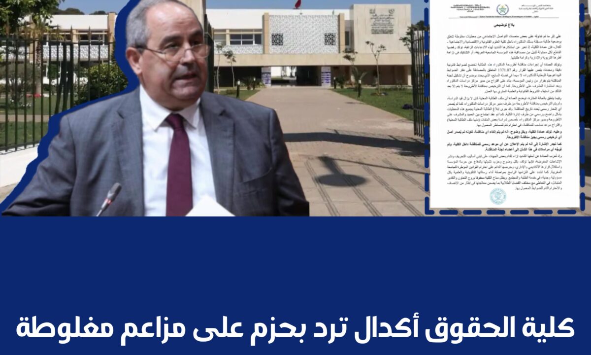 في رد رسمي حازم، خرجت عمادة كلية العلوم القانونية والاقتصادية والاجتماعية أكدال ببلاغ توضيحي، على خلفية ما راج مؤخراً عبر بعض منصات التواصل الاجتماعي من معلومات وصفتها بـ”الزائفة” بشأن وضعية طالبة مسجلة في سلك الدكتوراه داخل الكلية.