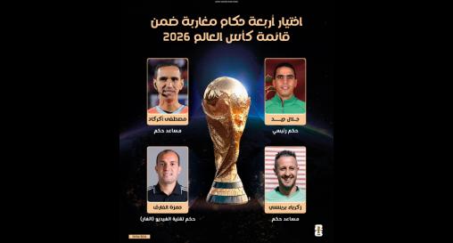 تم اختيار أربعة حكام مغاربة ضمن القائمة النهائية للحكام الدوليين الذين سيشرفون على إدارة مباريات نهائيات كأس العالم 2026 لكرة القدم، المقرر تنظيمها ما بين 11 يونيو و19 يوليوز بكل من الولايات المتحدة وكندا والمكسيك.
