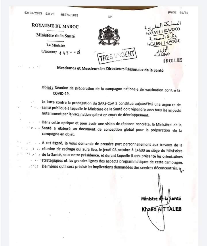 وحسب وثيقة توصل بها موقع” استثمار “فقد احتضن مقر وزارة الصحة اليوم الخميس اجتماعا ترأسه وزير الصحة، خالد ايت الطالب، بحضور المديرين الجهويين للوزارة، خصص لاطلاعهم على تفاصيل الحملة التي ستنطلق خلال الأيام المقبلة، وذلك في إطار تحضير الموارد البشرية واللوجيستيكية لإنجاح الحملة الوطنية للتلقيح ضد وباء كوفيد19.