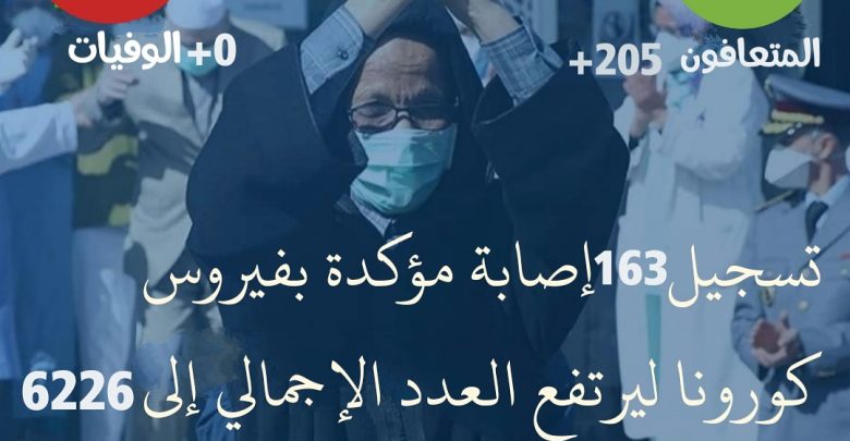 ارتفع عدد المصابين بفيروس كورونا في المغرب إلى 6226حالة، بعد تسجيل 163حالة جديدة ثبتت إصابتها حسب تحاليل مخبرية، وفق آخر إحصائيات لوزارة الصحة.