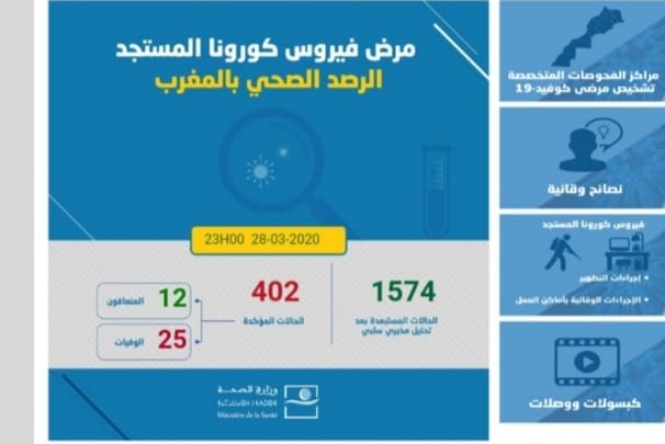 أعلنت وزارة الصحة عن ارتفاع الحالة الوبائية بفيروس كورونا إلى 12 حالة مؤكدة جديدة بالمغرب ليرتفع العدد الإجمالي إلى 402 حالة.