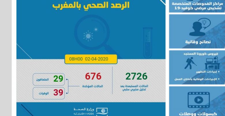 أعلنت وزارة الصحة إلى حدود الساعة 9 صباح من اليوم الخميس عن ارتفاع عدد حالات الإصابات بفيروس كورونا الى 22 حالة مؤكدة بحسب موقع وزارة الصحة، ليبلغ العدد الإجمالي 676 حالة مؤكدة ، فيما الوفيات لا زالت تبلغ 39 وفاة.