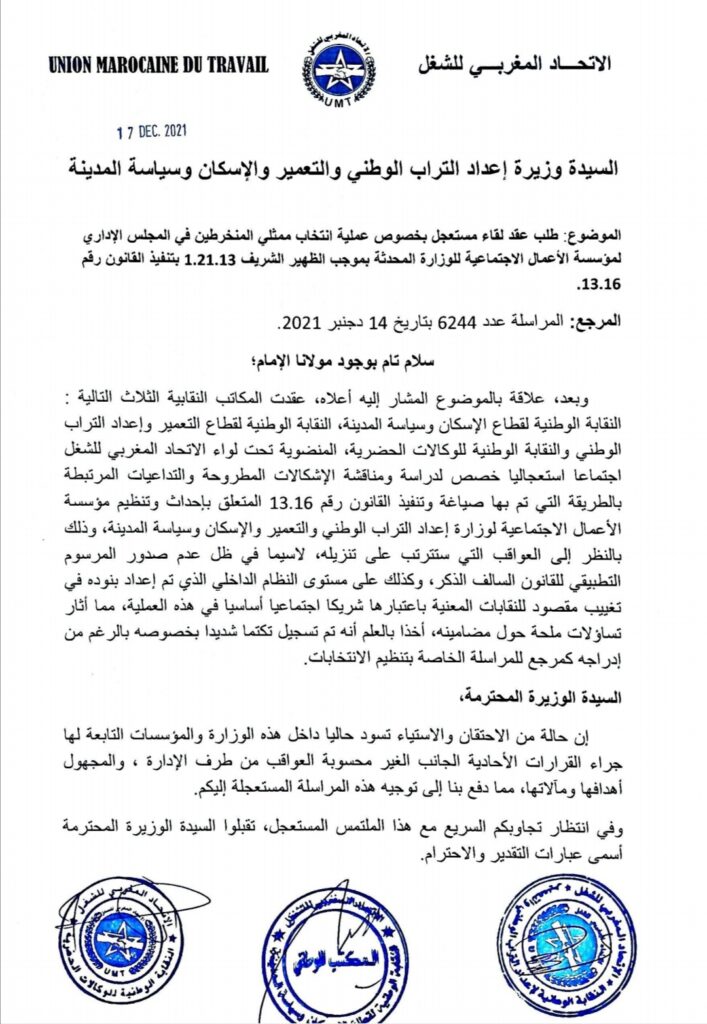 بسبب وجود حالة من الاحتقان والاستياء الذي يسودان حاليا داخل وزارة فاطمة المنصوري والمؤسسات التابعة لها، بادرت المكاتب النقابية الثلاثة (النقابة الوطنية لقطاع الإسكان وسياسة المدينة النقابة الوطنية لقطاع التعمير وإعداد التراب الوطني، والنقابة الوطنية للوكالات الحضرية)، إلى طلب لقاء عاجل مع وزيرة إعداد التراب الوطني والتعمير والاسكان وسياسة المدينة بخصوص عملية انتخاب ممثلي المنخرطين في المجلس الإداري لمؤسسة الأعمال الاجتماعية للوزارة المحدثة بموجب الظهير الشريف 1.21.13 بتنفيذ القانون رقم 13.16.