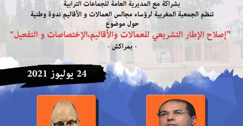 تنظم الجمعية المغربية لرؤساء مجالس العمالات والأقاليم بشراكة مع المديرية العامة للجماعات الترابية ندوة وطنية حول موضوع “إصلاح الإطار التشريعي للعمالات والأقاليم الاختصاصات والتفعيل”، في احترام تام للتدابير الوقائية والاحترازية والإجراءات الصارمة المعمول بها في مواجهة تفشي جائحة كورونا.