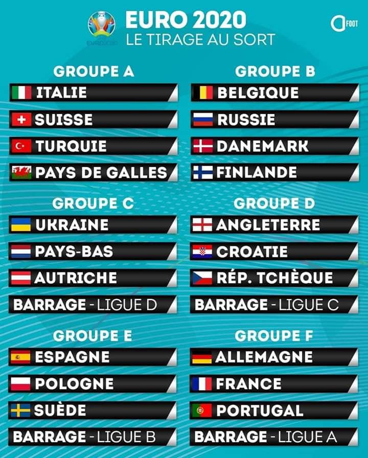 أسفرت قرعة بطولة كأس أروبا للأمم 2020، التي أقيمت اليوم السبت في العاصمة الرومانية بوخاريست، على مجموعات قوية، أبرزها المجموعة  السادسة، التي تعتبر  مجموعة الموت بدون منازع، وتعرف تواجد كل من ألمانيا، فرنسا والبرتغال، في مجموعة واحدة.ومن المنتظر أن تقام هذه البطولة، التي تعرف مشاركة 24 منتخبًا، في 12 مدينة أروبية مختلفة.وضمن 20 منتخبا تأهلهم للنهائيات عبر التصفيات المؤهلة للبطولة، وفي انتظار 4 منتخبات أخرى ستتأهل عبر الملحق الذي سيخوضه 16 منتخبًا في مارس 2020… وهنا تشكيل المجموعات الست
